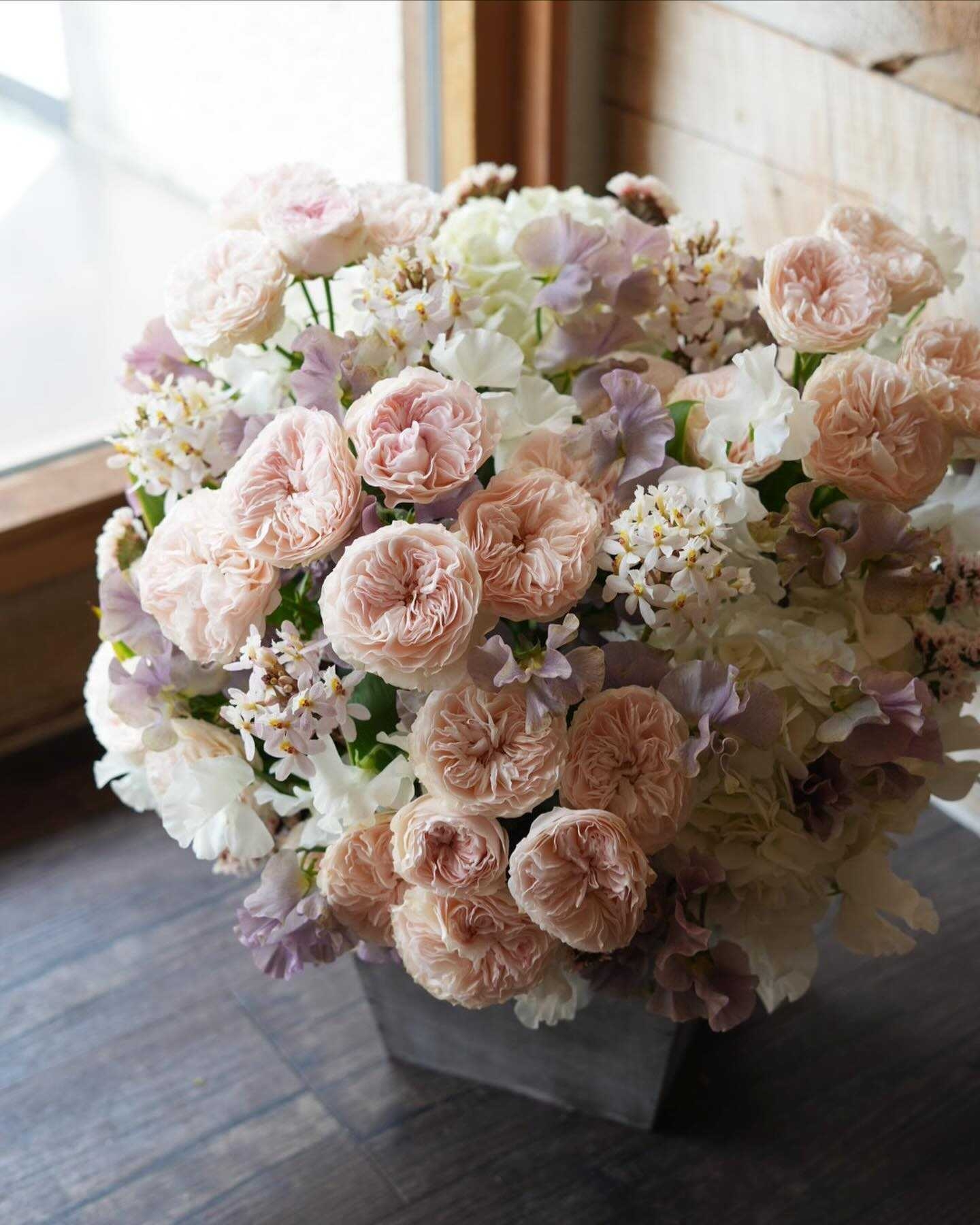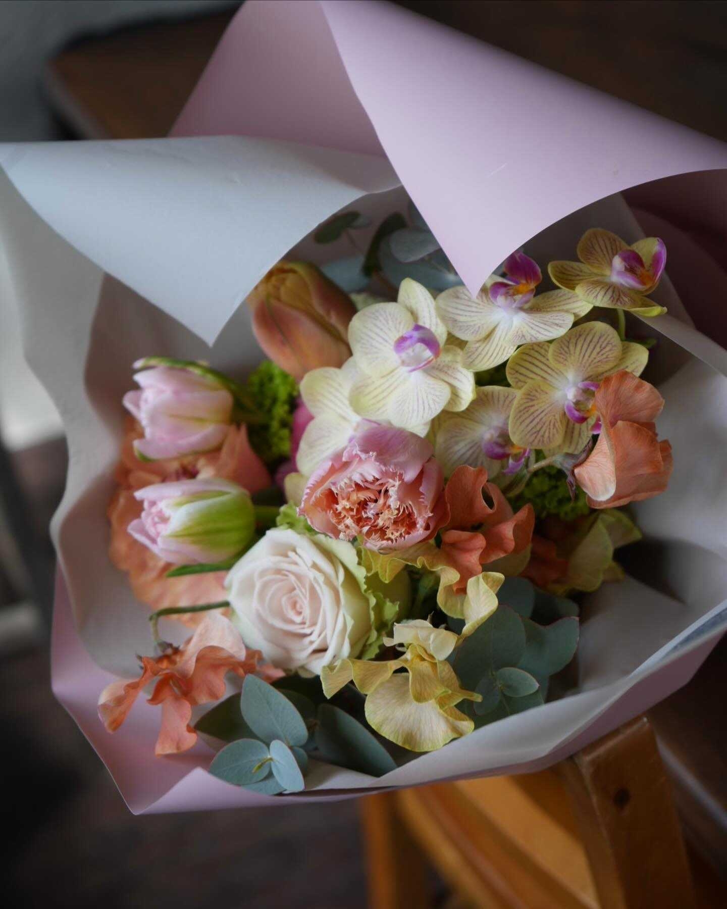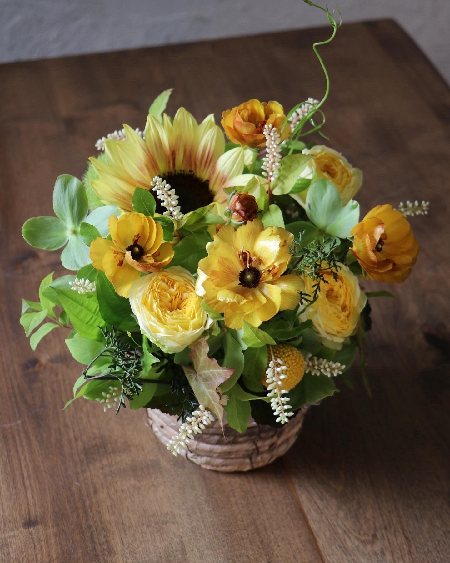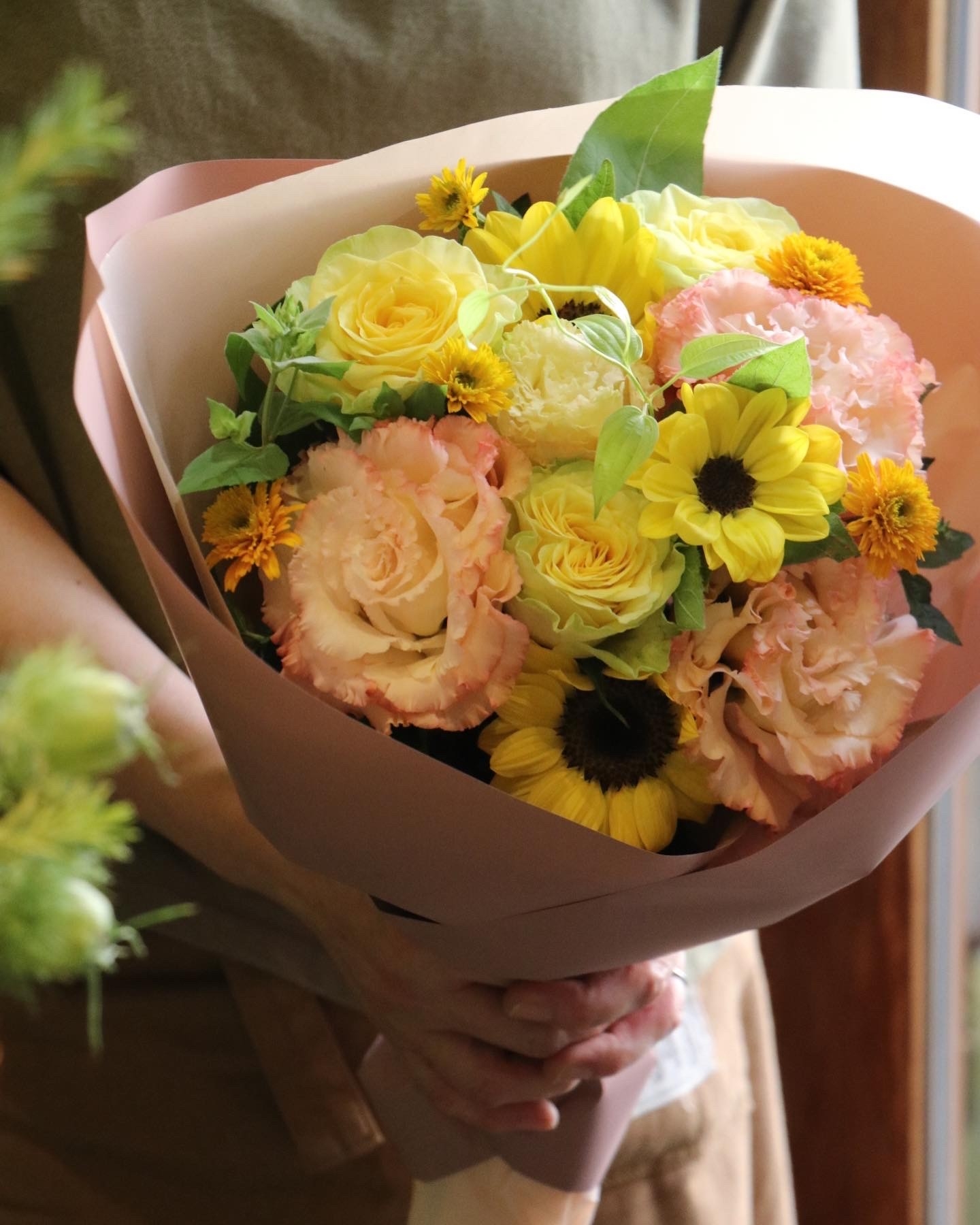 当店では、季節の旬の木花を用いて、おまかせで木花を包ませて頂いております。サイズ指定と色等のご要望は受け付けておりますが、その他の詳細なデザインや花材の選定は、当店のフローリストにおまかせください。